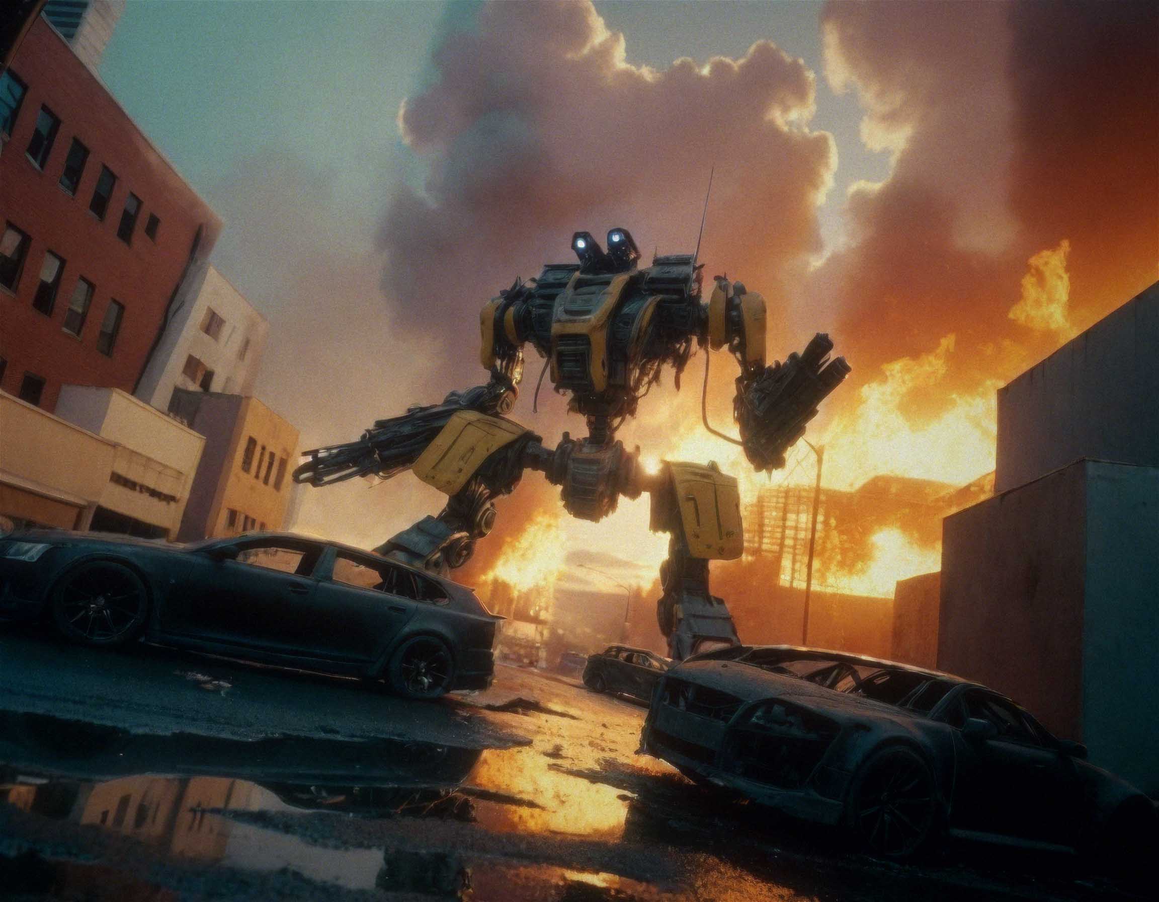 In this output – “buildings on fire” ended up adding fire to the robot itself.