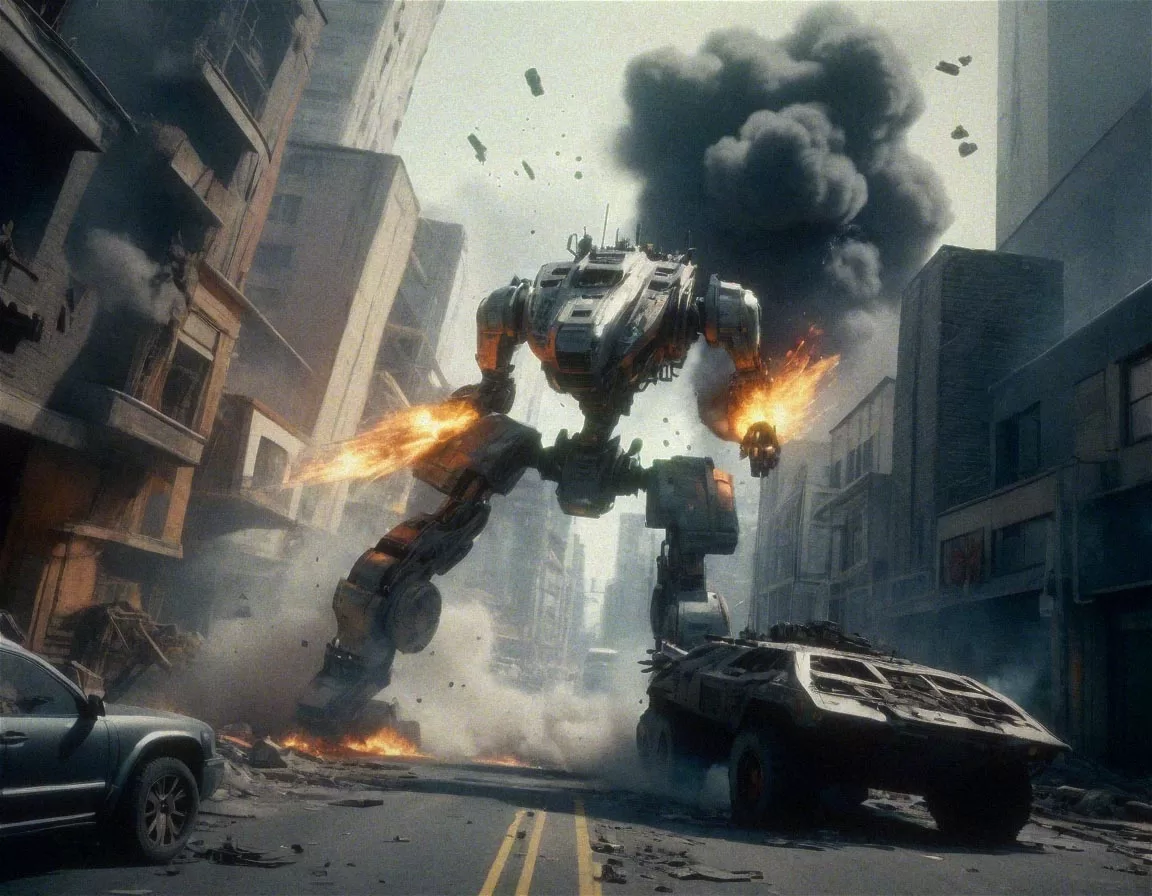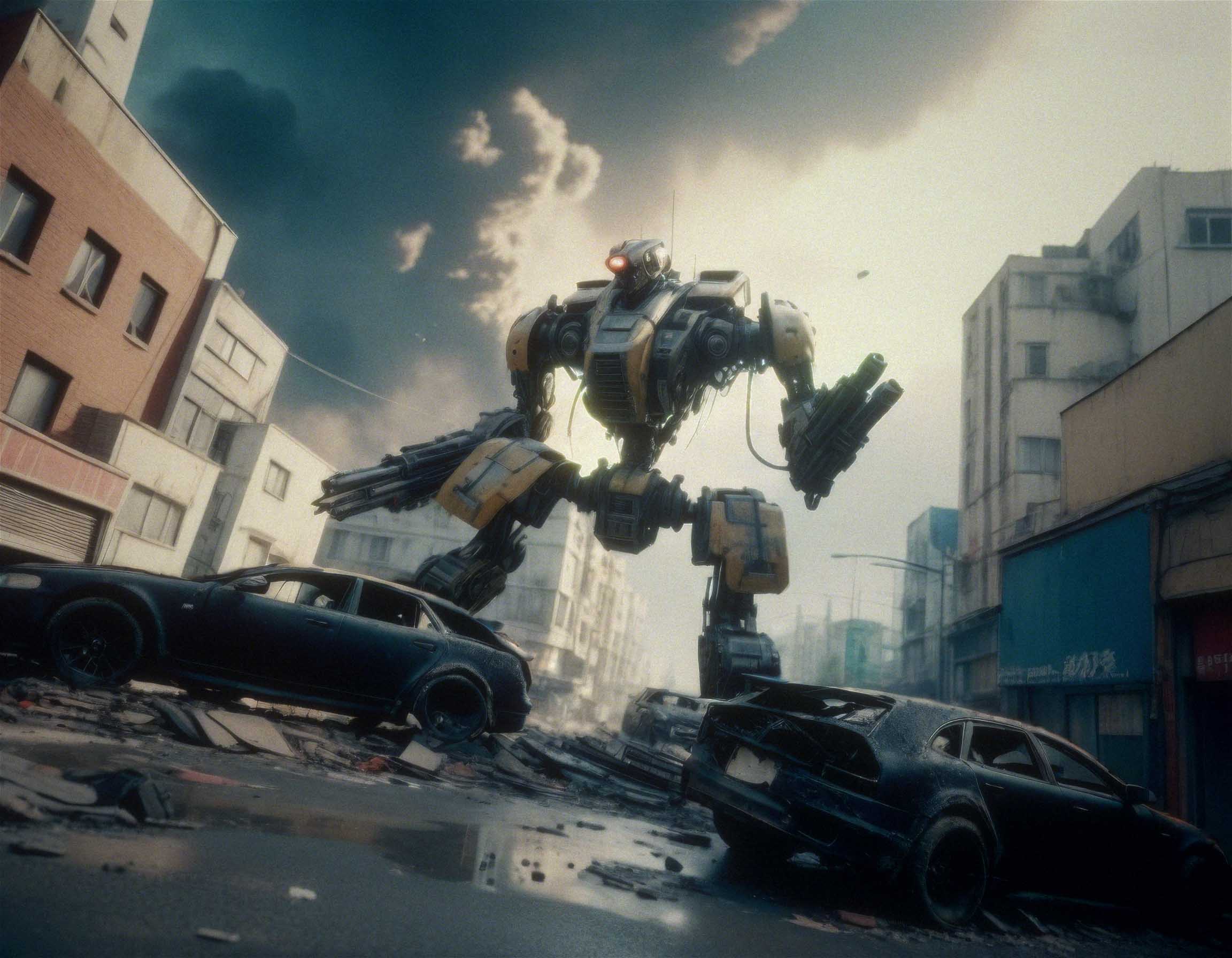 detailed big combat robot, destroying a city, cars in the street,