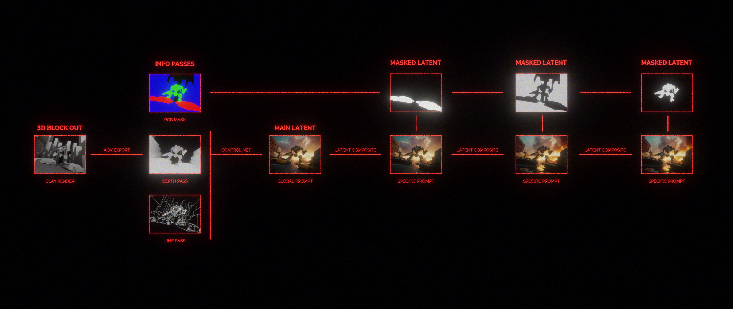 This research explores a workflow to enhance control over AI-generated images by utilizing 3D block out techniques and region-specific subgenerations, defined by RGB AOVs. This approach utilizes ComfyUI and Stable Diffusion XL models.