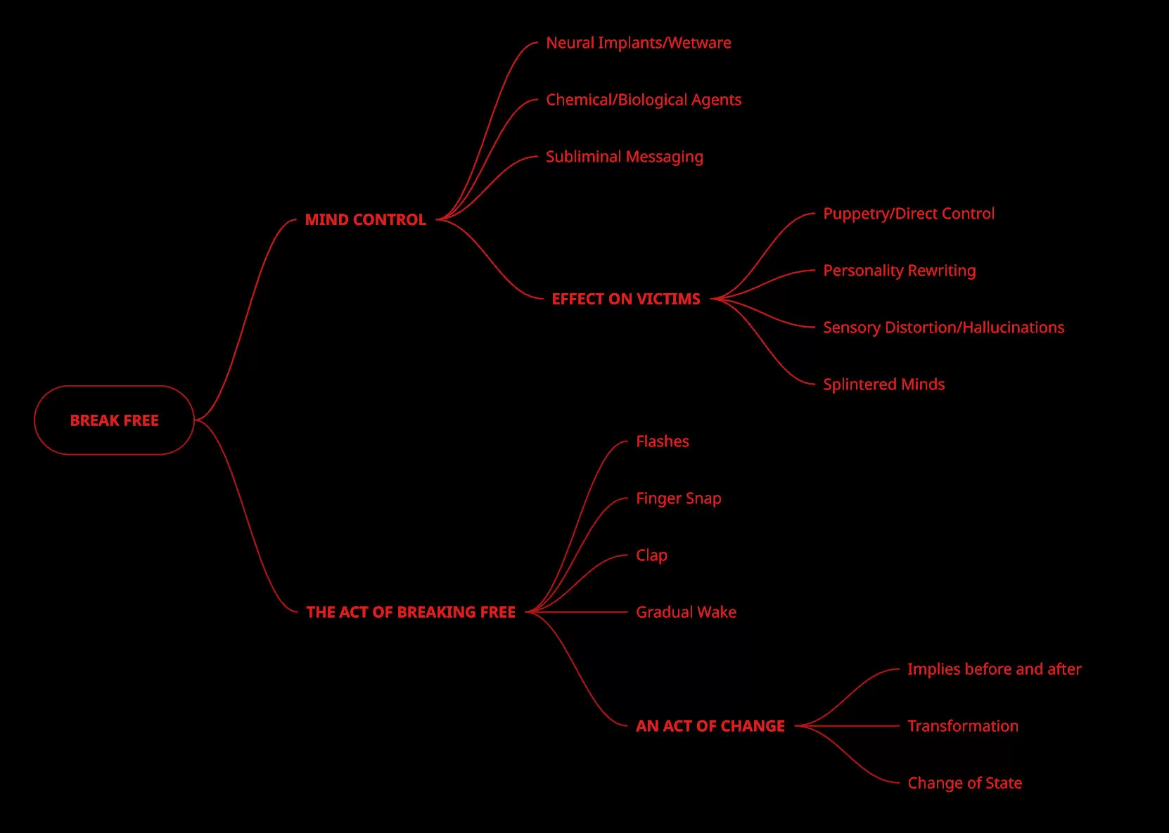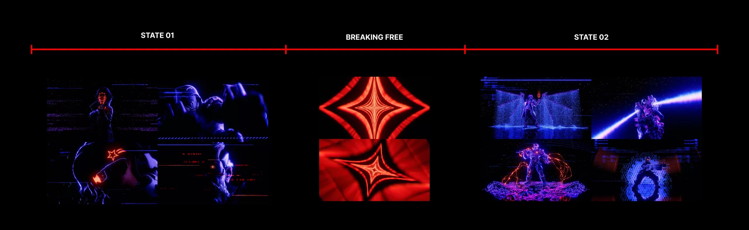 The “change of state” implied by breaking free led me to structure the animation in two phases: an initial, ominous silhouette stage representing confinement, followed by a transition into each character’s fully realized form, emphasizing strength and empowerment.